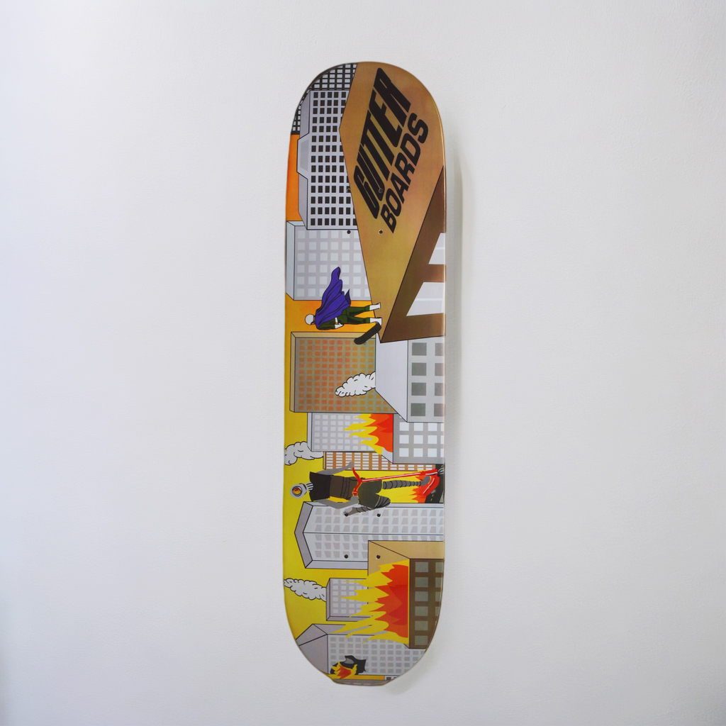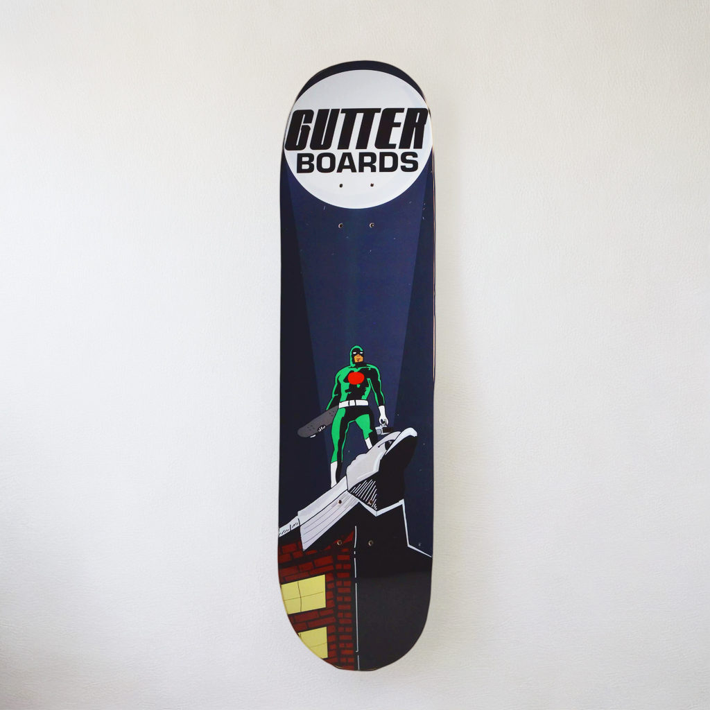Gutter Boards is a skateboard company inspired by comic imagery that supplants classic superhero styles onto skateboard photography to create unique products. This mixture of visual styles is untapped, but comics and skateboarders share many overlaps in how iconic characters and personalities are photographed and presented; this allows for seamless combinations of Gutter Boards’ influences that result in designs shown below.
